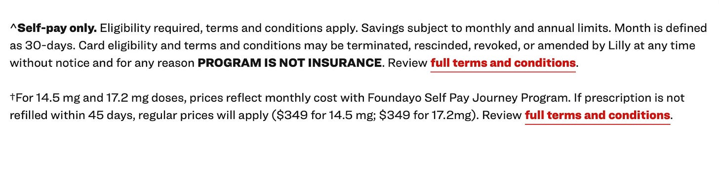 The catch: if your prescription isn’t renewed in a timely fashion, your price reverts to the higher cash pay price. For the 14.5mg dose of Lilly’s Foundayo, that’s a difference of $50 as of this writing ($299/month with refills within 45 days, or $349 without the discount). Novo Nordisk’s Wegovy pill is also $299/month.