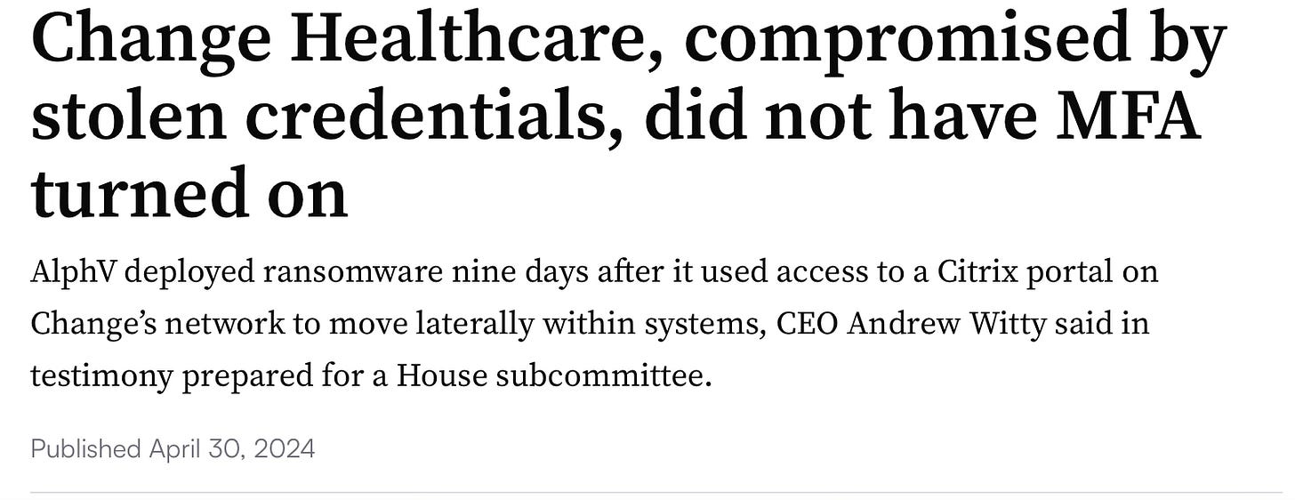 Less than 18 months later, many of the concerns raised by the DOJ and others by UHG/Change’s combined size were revealed to be accurate when Change experienced a cyberattack on its systems (it didn’t have multi-factor authentication protecting its data on roughly 55 million Americans…). Change’s payment system went offline in the wake of the attack, leaving physicians unable to access reimbursement for many of their claims. Eventually, this became a backlog of at least $14 billion owed to physician practices.