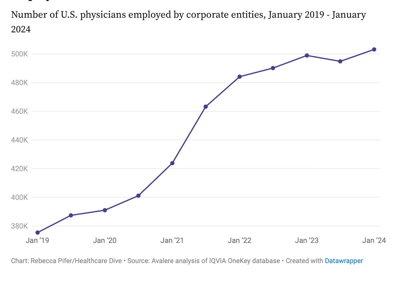 Independent practices are struggling. Nearly 80% of doctors now work for a corporate entity, a number that increased following the chaos of the early Covid period. For doctors trying to stay independent, the margins are low, the regulatory and administrative burden is high, and they’re on the weaker side of a consolidation arms race: the bigger the insurers get, the more doctors need to consolidate to keep their ability to negotiate competitively. In 2024, a survey of physicians by the AMA found that the most frequently cited reason for why the physicians had sold their practices to a corporate entity was the need for more negotiating power.